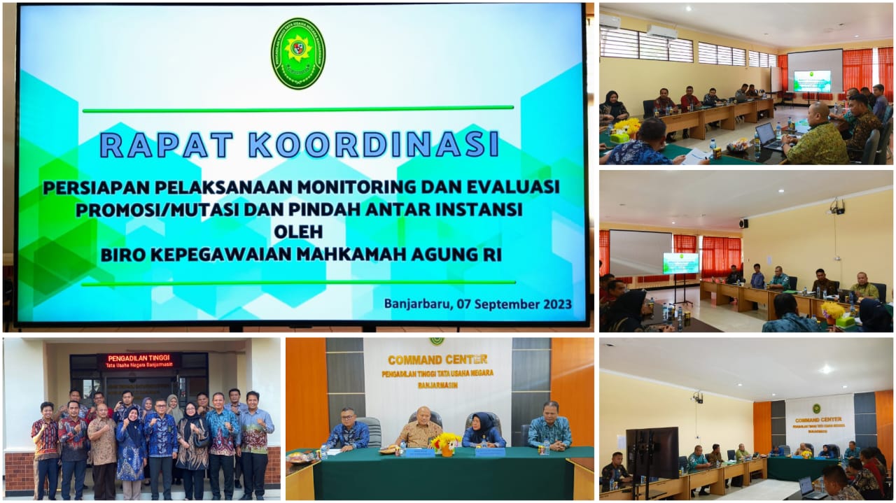 Pada kunjungan ini, Dalam Rangka Kegiatan Rapat Koordinasi Persiapan Pelaksanaan Monitoring dan Evaluasi Promosi/ Mutasi dan Pindah Antar Instansi. Bertempat di Ruang Command Center Pengadilan Tinggi Tata Usaha Negara Banjarmasin, Plt. Kepala Biro Kepegawaian Mahkamah Agung RI Supatmi, S.H., M.M. menyampaikan, bahwa diharapkan dengan adanya rapat koordinasi ini agar apa yang menjadi kendala-kendala di bagian kepegawaian dapat diselesaikan dengan kegiatan tatap muka seperti ini. Selain memberikan arahan tentang aturan dalam Promosi/Mutasi dan Pindah Antar Instansi, juga dilakukan diskusi dan tanya jawab oleh Pejabat dan Pegawai pada Pengadilan Tinggi Tata Usaha Negara Banjarmasin.