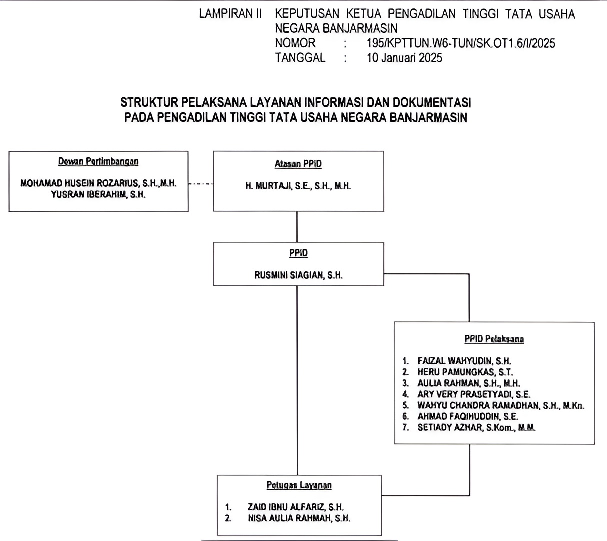 Dalam rangka memberikan layanan informasi Publik sebagaimana diamanatkan dalam Undang-Undang Nomor 14 Tahun 2008 tentang Keterbukaan Informasi Publik dan Surat Keputusan Ketua Mahkamah Agung Nomor 2-144/KMA/SK/VIII/2022 tentang Pedoman Pelayanan Informasi di Pengadilan, Pada Tahun 2025 Ketua Pengadilan Tinggi Tata Usaha Negara Banjarmasin telah menetapkan telah membentuk Tim Pelaksana Pelayanan Informasi Publik dengan Nomor : 195/KPTTUN.W6-TUN/SK.OT1.6/1/2025 tentang Penunjukan Pejabat Pengelola Informasi dan Dokumentasi (PPID) di Pengadilan Tinggi Tata Usaha Negara Banjarmasin dan berdasarkan keputusan tersebut Ketua Pengadilan Tinggi Tata Usaha Negara Banjarmasin telah menetapkan Pejabat Pengelola Informasi dan Dokumentasi (PPID), PPID Pelaksana dan Petugas Layanan Informasi pada Pengadilan Tinggi Tata Usaha Negara Banjarmasin.