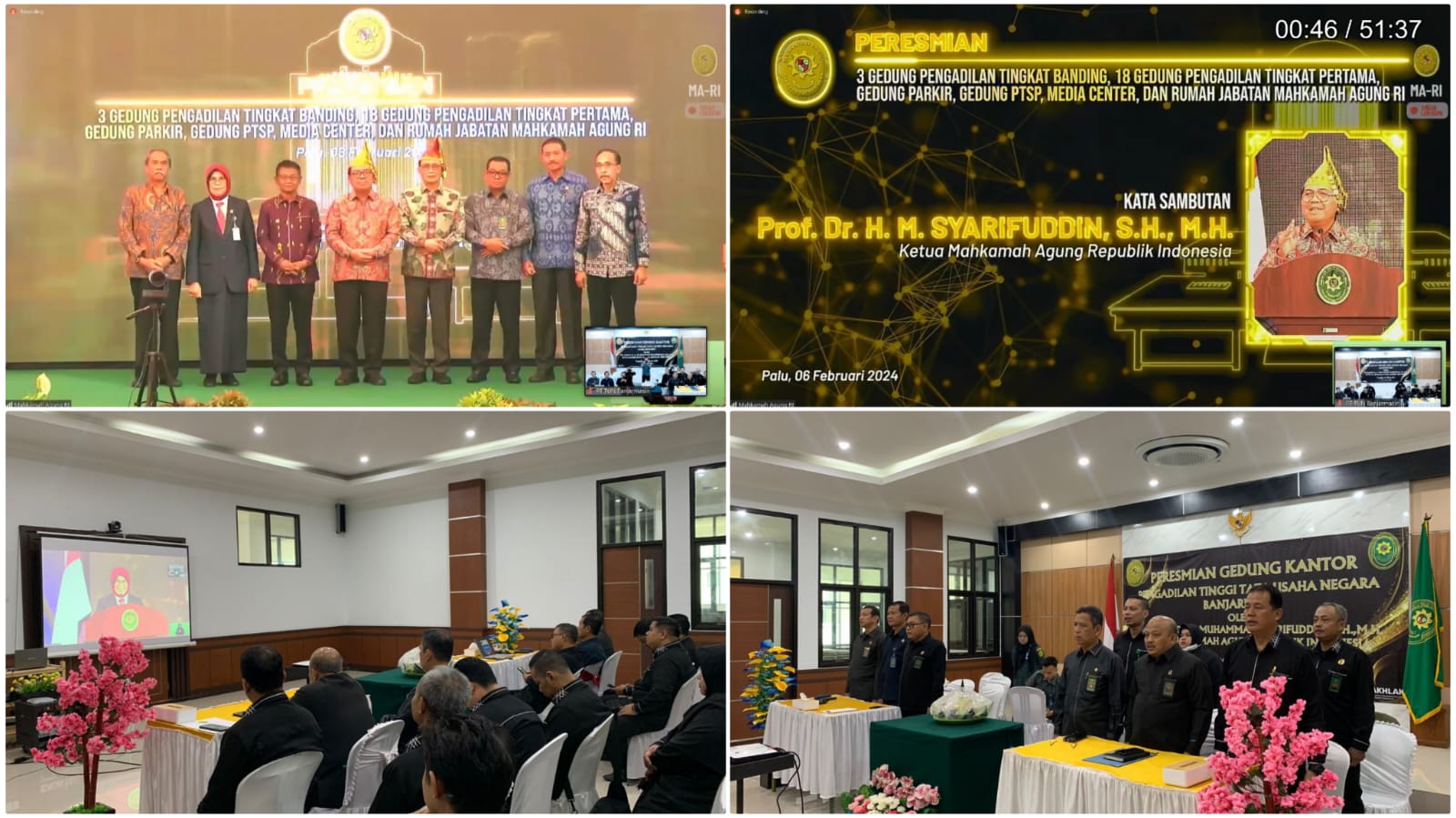 Banjarbaru | Selasa, 6 Februari 2024. Bertempat di Ruang Serbaguna Pengadilan Tinggi Tata Usaha Negara Banjarmasin, dilaksanakan Kegiatan Zoom Meeting Peresmian Gedung Kantor Pengadilan Tinggi Tata Usaha Negara Banjarmasin oleh Ketua Mahkamah Agung Republik Indonesia YM Bapak Dr. H. Muhammad Syarifuddin, S.H.,M.H. didalam Acara/Kegiatan Peresmian 3 Gedung Pengadilan Tingkat Banding, 18 Gedung Pengadilan Tingkat Pertama, Gedung Parkir, Gedung PTSP, Media Center, dan Rumah Jabatan Mahkamah Agung RI yang diselenggarakan di Palu dan dihadiri langsung oleh Ketua Pengadilan Tinggi Tata Usaha Negara Banjarmasin YM Bapak Dr. H. Bambang Heriyanto, S.H.,M.H. beserta segenap Aparatur Pengadilan Tinggi Tata Usaha Negara Banjarmasin hadir secara Daring di Gedung Baru pada Ruangan Serbaguna Pengadilan Tinggi Tata Usaha Negara Banjarmasin.