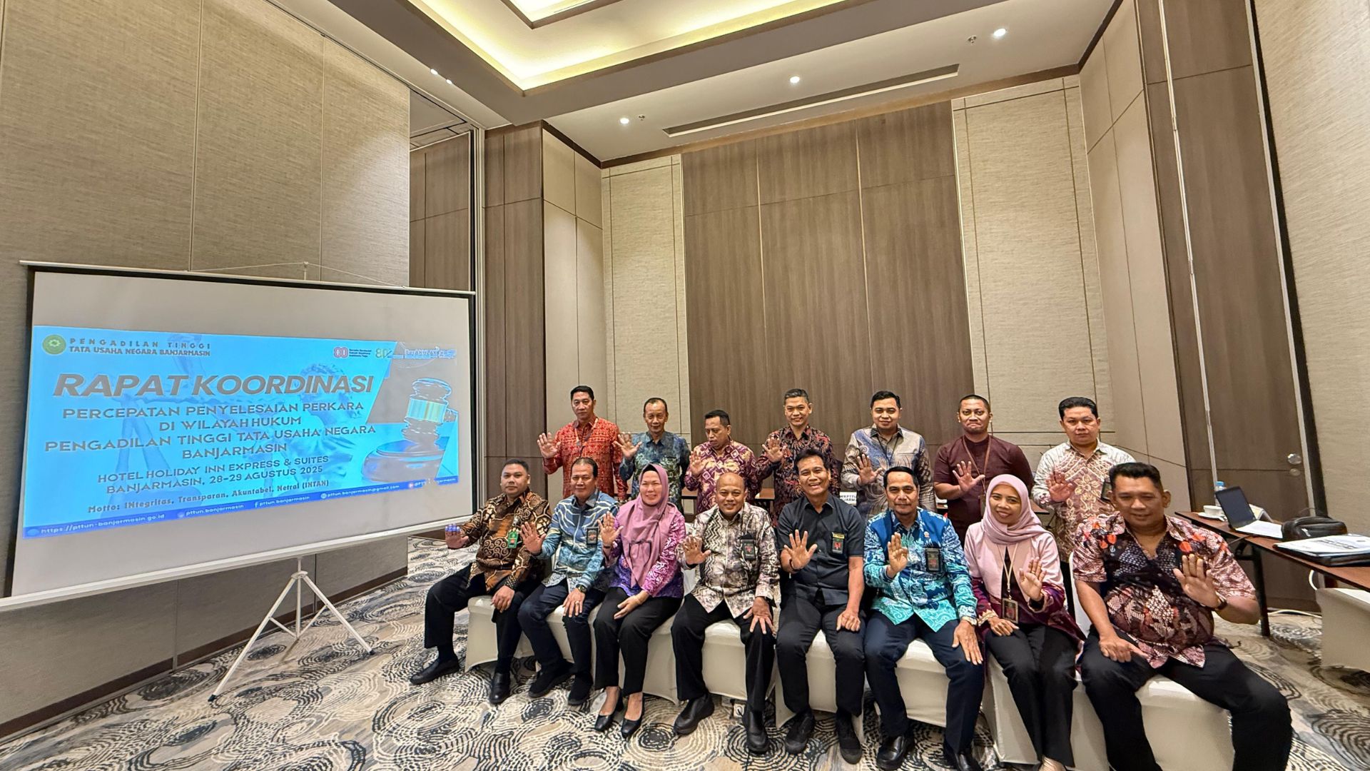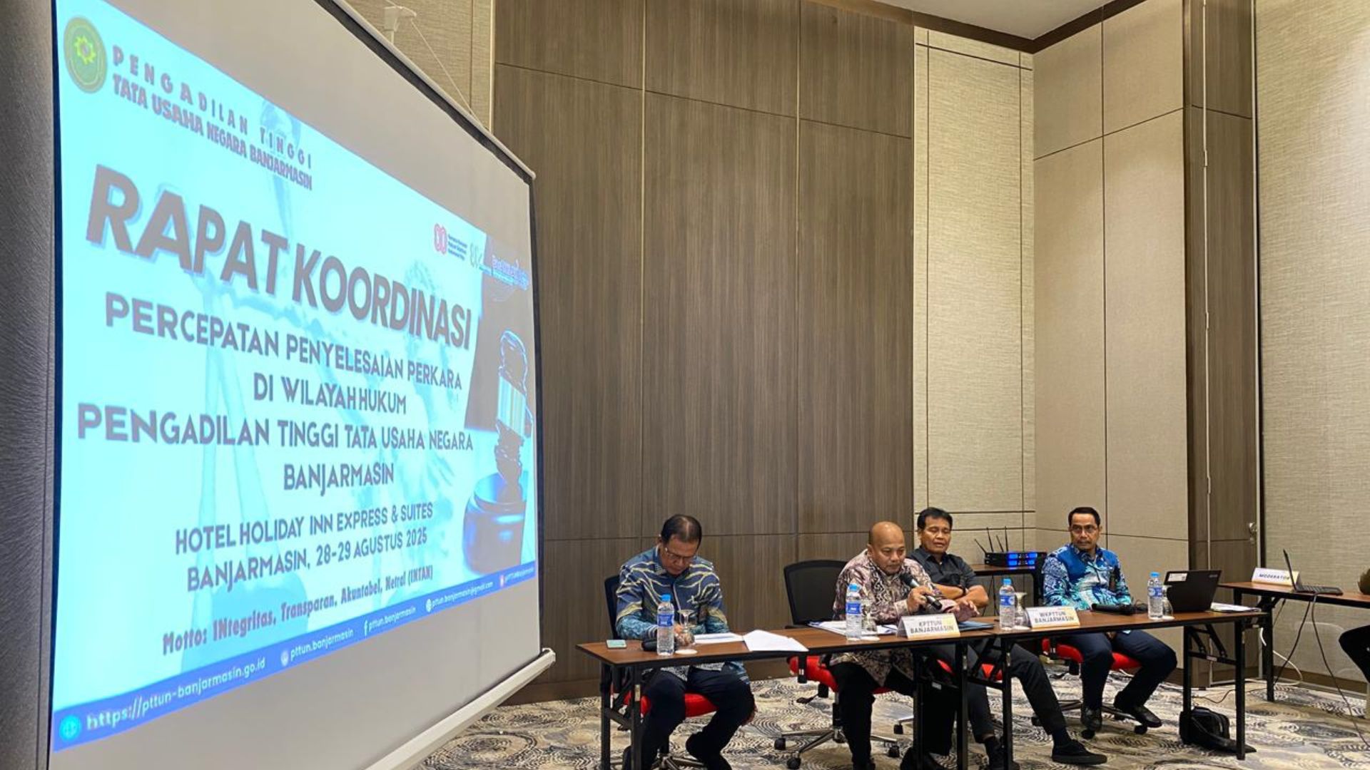 Banjar – 28 s.d 29 Agustus 2025 – Pengadilan Tinggi Tata Usaha Negara (PTTUN) Banjarmasin menggelar rapat koordinasi dalam rangka Percepatan Penyelesaian Perkara di wilayah hukum PTTUN Banjarmasin. Kegiatan yang dilaksanakan di Ballroom Hotel Holiday Inn Express & Suites Banjarmasin. Kegiatan ini dihadiri oleh Ketua PTTUN Banjarmasin, Bapak MOHAMAD HUSEIN ROZARIUS, S.H., M.H., didampingi oleh Wakil Ketua, Panitera, Panitera Muda, Sektretaris, Kabag Perencanaan dan Kepegawaian serta Pejabat Fungsional dan Pegawai PTTUN Banjarmasin. Dalam Kegiatan ini PTTUN Banjarmasin turut serta mengundang Ketua, Wakil Ketua, dan Panitera dari empat satuan kerja, yaitu Pengadilan Tata Usaha Negara (PTUN) Banjarmasin, Pengadilan Tata Usaha Negara (PTUN) Palangkaraya, Pengadilan Tata Usaha Negara (PTUN) Samarinda, dan Pengadilan Tata Usaha Negara (PTUN) Pontianak.