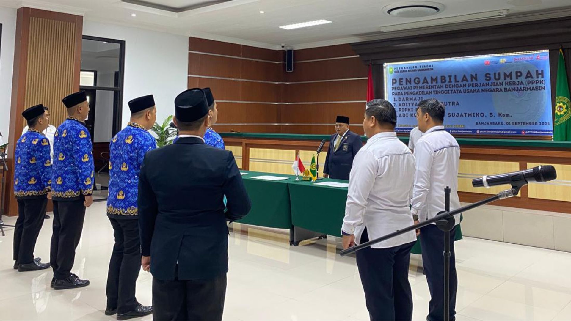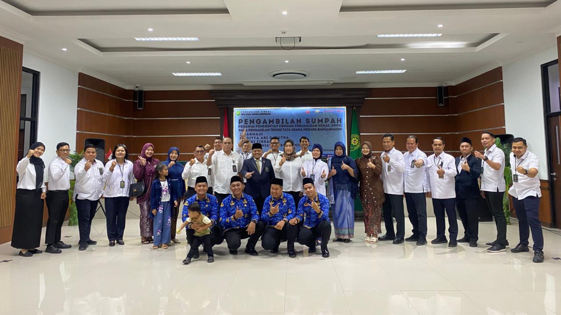 Banjarbaru – 01 September 2025 – Pengadilan Tinggi Tata Usaha Negara (PTTUN) Banjarmasin melaksanakan acara Pengambilan Sumpah Pegawai Pemerintah dengan Perjanjian Kerja (PPPK) pada Senin, 01 September 2025. Kegiatan ini berlangsung di Ruang Sidang Utama Cakra PTTUN Banjarmasin berjalan dengan penuh khidmat dan dihadiri oleh Ketua, Bapak MOHAMAD HUSEIN ROZARIUS, S.H., M.H., para Hakim Tinggi, Panitera, Sekretaris, Pejabat Struktural dan Fungsional serta seluruh Pegawai dan PPNPN PTTUN Banjarmasin.