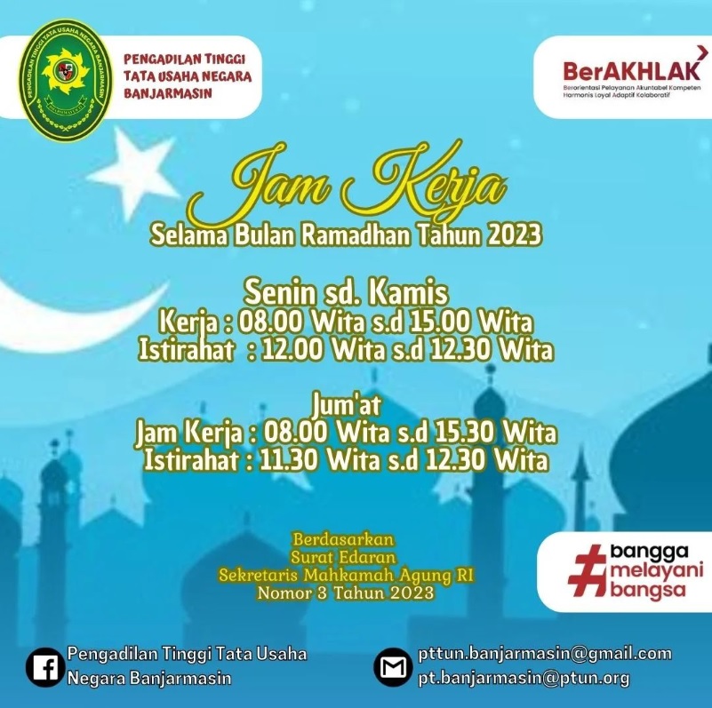 Penetapan Jam Kerja Pengadilan Tinggi Tata Usaha Negara Banjarmasin, berdasarkan Surat Edaran Sekretaris Mahkmah Agung RI Nomor 3 Tahun 2023